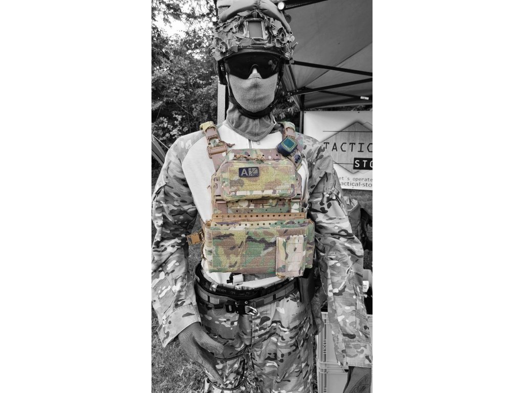 Přední část je tvořena lasercut laminátem cordury s velcro molle vazbou po téměř celém povrchu. Jsou zde zpevněné výřezy pro uchycení spony nebo g-hooku front flapu nebo ptt. Velcro molle slouží jak pro připevnění pouzder tak pro možnost umístit nášivky nebo bočnice. V horní části jsou ramenní popruhy na které je možné umístit jak qrs sponu (duraflex, 2M atd) tak oval ring (součást balení), který poskytuje nízký profil oproti qrs sponam. Popruhy se následně fixuji na vnitřní straně přední části pomocí velcra. Vnitřní stranu tvoří elastický materiál pro nejlepší fixaci plátu. Velcro panely z vnitřní strany slouží k jištění ramenních popruhů, uchycení 3D Polstrování (součást balení) nebo umístění pouzder s měkkou balistikou (prodávány zvlášť ZDE). Na spodní chlopni uzavírající kapsu na plát je odlehčené lasercut molle.
