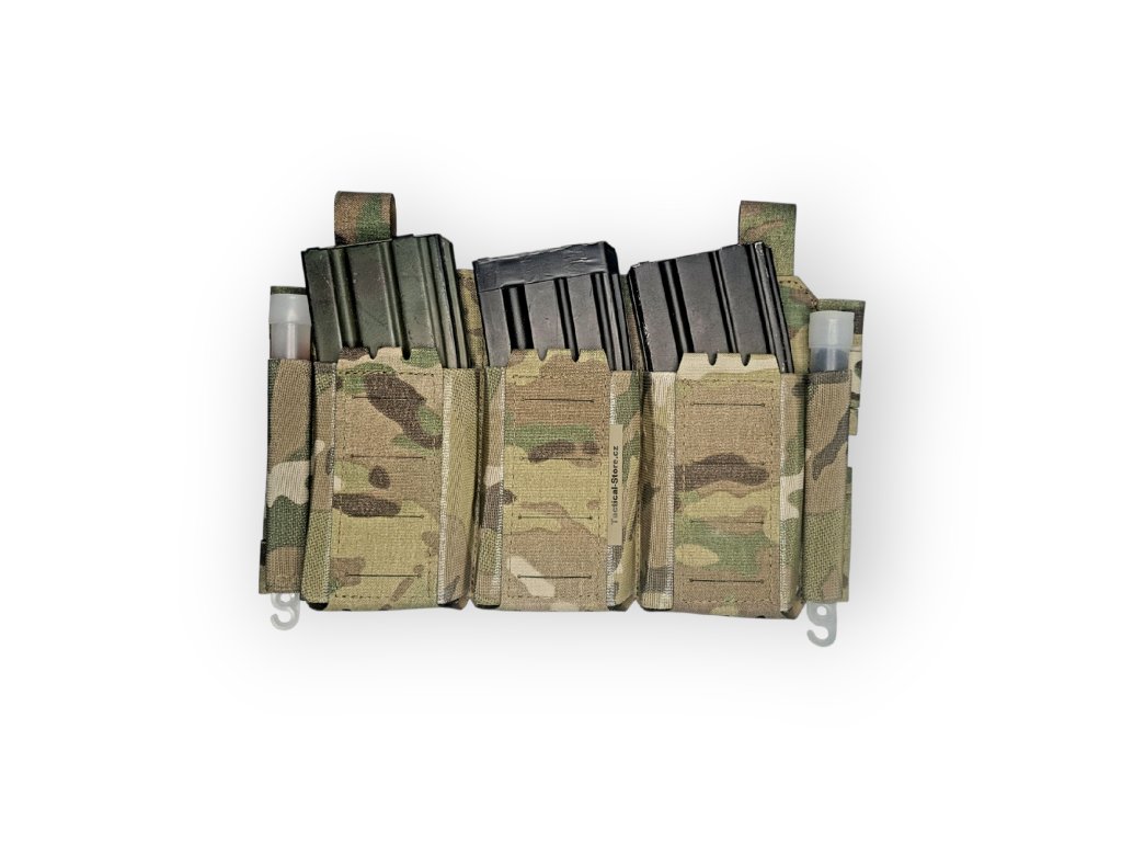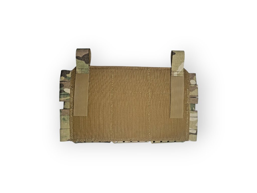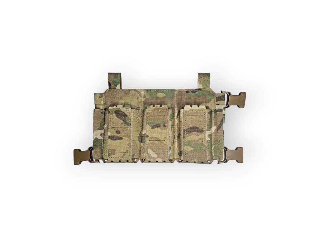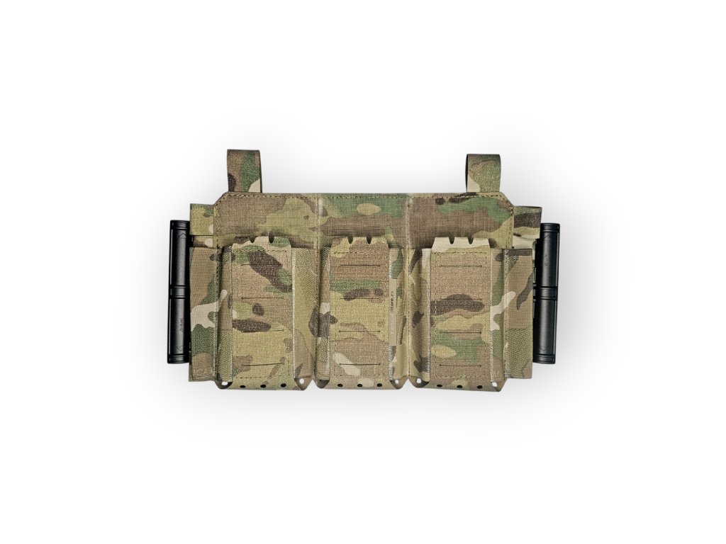 Přední flap pro nosiče plátů na 3 zásobníky AR. Sumky jsou udělané jako elastické s 1 sloupcem molle v přední části. Možnost umístění admin panelu special. Zadní strana velcro hook a z boku umístěny průvleky na qrs spony nebo klasické spony. Pro vytvoření chestrigu stačí přidat qrs spony a chestrig mode s H rameny nebo 5 plastových spon s bedernim popruhem , H popruhy a zadni panel z mesh síťoviny. Na bocích jsou místa pro lightsticky nebo fixy. Pro upevnění na nosič nebo ramena je potřeba koupit i spony nebo ghooky.